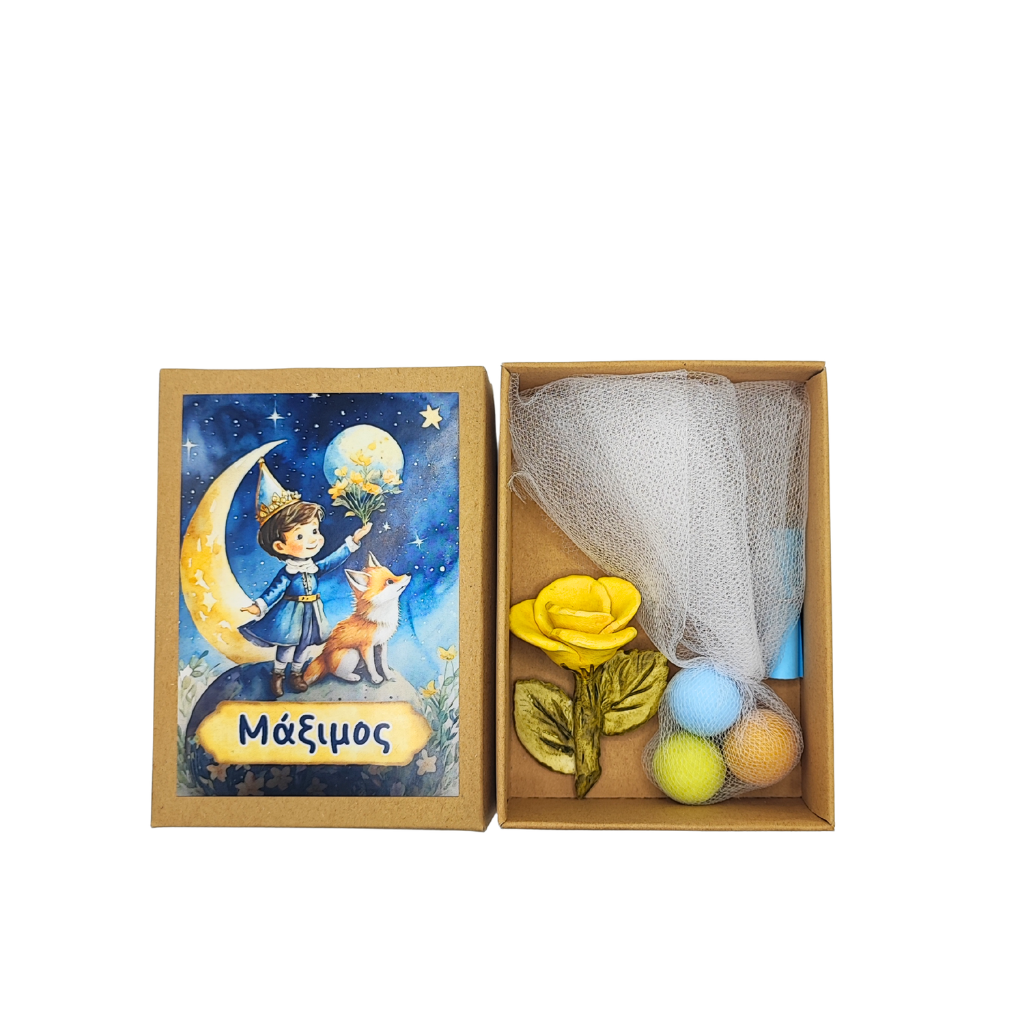 Μπομπονιέρα ➺ Κουτί κραφτ (10,5×7,5cm) με προσωποποιημένη ετικέτα ανάλογη του θέματος/στολισμού σας.