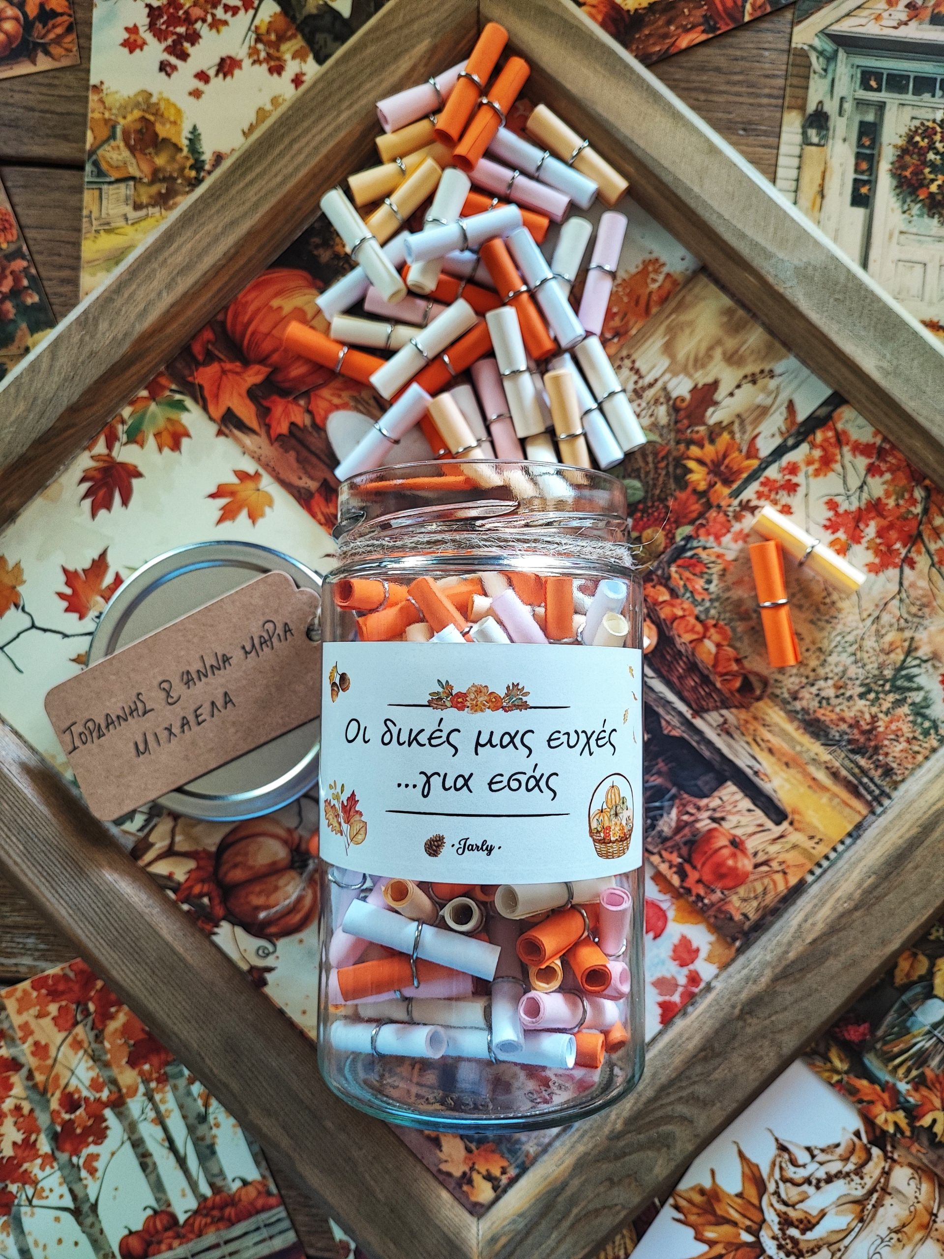 Πρόκειται για ένα προσωποποιημένο βαζάκι με 150 παπυράκια – ευχές, το/α χρώμα/τα των οποίων μπορείτε να επιλέξετε από μια παλέτα 15 διαφορετικών αποχρώσεων (Λευκό, Ιβουάρ, Πράσινο, Φυστικί, Κόκκινο, Φούξια, Ροζ παλ, Μωβ, Πορτοκαλί, Χρυσοκίτρινο, Βερυκοκί, Γαλάζιο, Γκρι, Πράσινο μπιζελιού, Κίτρινο).