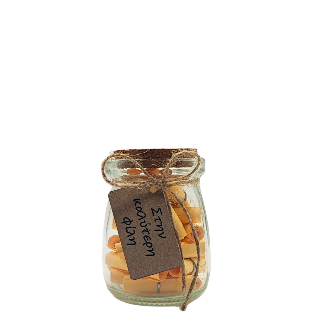 Το βαζάκι περιλαμβάνει 60/100 παπυράκια «Περί φιλίας» με παροιμίες, ρητά & εμπνευσμένα αποσπάσματα από ανθρώπους των επιστημών, των γραμμάτων και τεχνών.